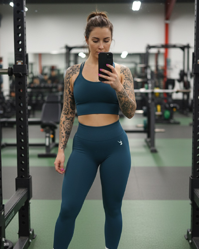 "Honestly the confidence boost this set gives me is unreal. The scrunch bum leggings shape my body, snatch my waist and does wonders for the booty! The strappy sports bra is super cute, I love it all!!"